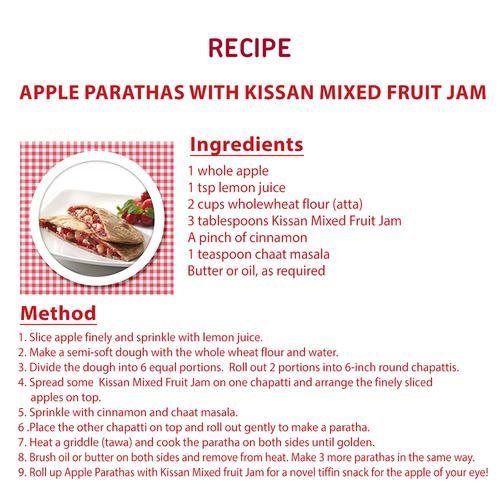 • Kissan Mixed Fruit Jam is made with 100% real fruit Ingredients • Is easy to use and can be enjoyed on the go every morning • Enjoy it best with Bread, Roti, Paratha or Dosa for a wholesome breakfast • Turns boring breakfast into an empty plate • Spreads easily with a spoon or a knife • Carefully sealed in impermeable glass packaging to retain the best flavour and taste of product