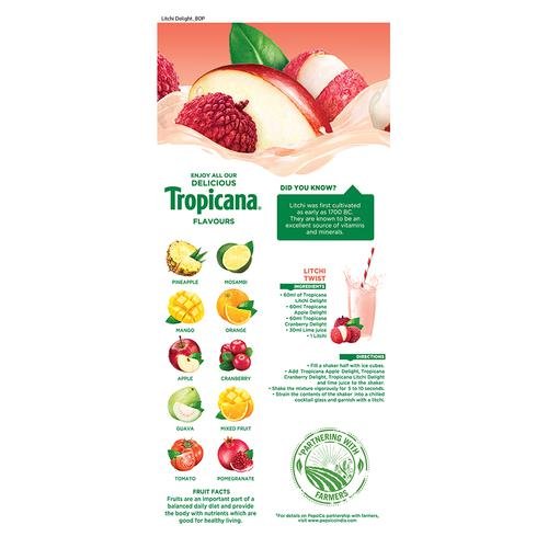 Savour the superior taste of hand-picked litchis! The sweet refreshing taste makes it a great ready to serve fruit beverage. A healthy addition to your daily breakfast. Did You Know? Litchi was first cultivated as early as 1700 BC. They are known to be an excellent source of vitamins and minerals. Special 6-layer protection gives you the goodness of tasty, ready to serve fruit beverage in every glass of Tropicana.