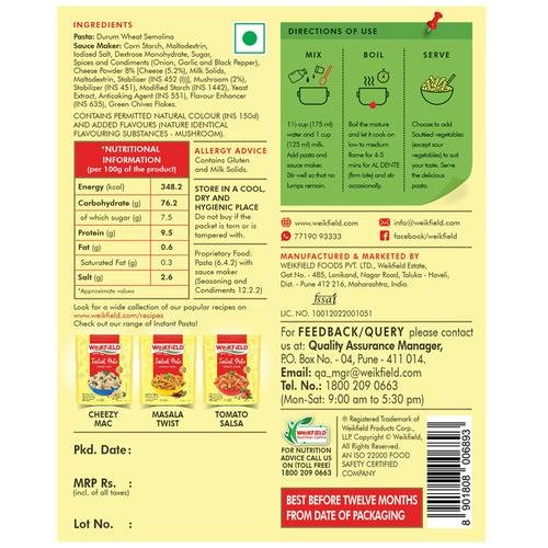 Weikfield Cheesy Creamy Pasta is made from high-quality ingredients. The pasta is made from durum wheat semolina. This creamy pasta is simple, quick and easy to make. This pasta makes a luxurious dinner that is buttery and delicate mushrooms drenched in a flavourful creamy sauce. Now enjoy this rich creamy pasta at home within minutes. It is perfect when you need a big bowl of comfort.